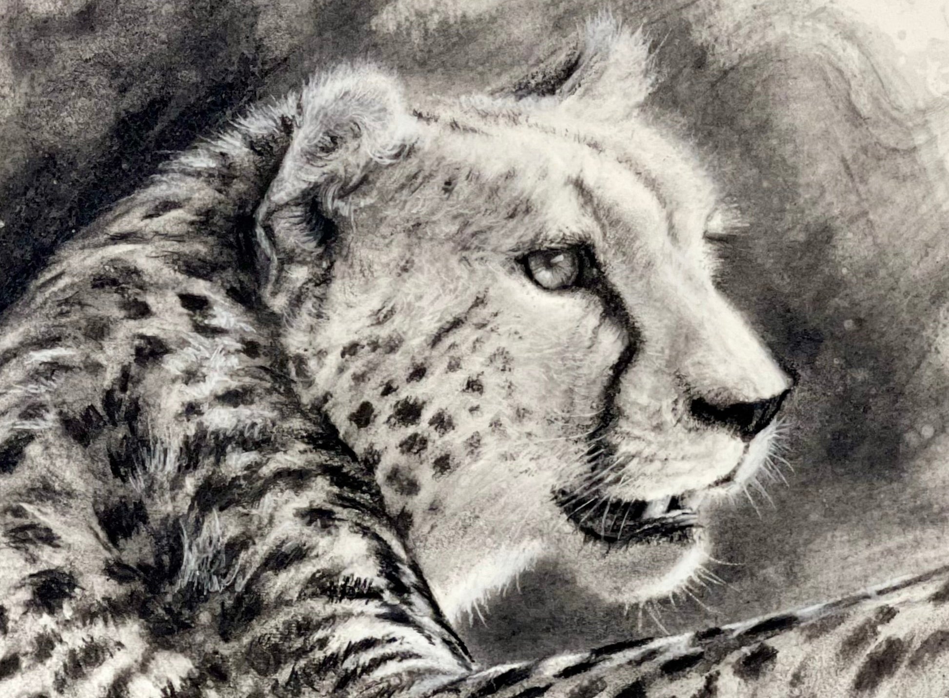 The cheetah is the embodiment of elegant power — the lightest, leanest of Africa’s big cats, built for extraordinary speed. Reaching bursts of up to 110 km/h, they rely on explosive acceleration, long flexible spines, and counterbalancing tails to outrun prey in short, intense chases. Their distinctive black tear marks are more than beautiful markings; they help reduce glare and sharpen focus during hunts, acting like natural sunshades. This charcoal artwork captures the alert poise of a predator always reading the landscape — a moment of stillness before the sprint. A striking, contemporary piece for collectors who admire Africa’s most refined and specialised hunter.